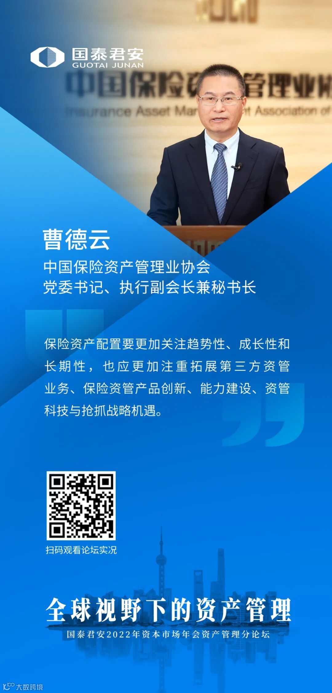 12月3日,国泰君安2022年资本市场云端年会资产管理分论坛——“全球视野下的资产管理”在云端开幕,中国保险资产管理业协会党委书记、执行副会长兼秘书长曹德云受邀为论坛致开幕辞。