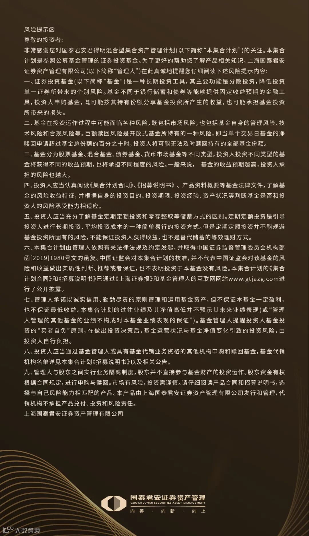 市场有风险,投资需谨慎。国泰君安资管承诺以恪尽职守、诚实信用、谨慎勤勉的原则管理和运用产品资产,但不保证一定盈利,也不保证最低收益。国泰君安资管旗下产品的过往业绩不构成对产品未来业绩表现的保证。投资者在进行投资前应当认真阅读产品合同、招募说明书、产品资料概要等信息披露文件,自主做出投资决策,自行承担投资风险。