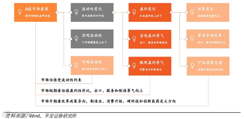 宏观环境呈现典型的“经济回升,政策收缩”特征。经济回升驱动力主要来自消费和出口,货币/信用拐点也将逐步显现。宏观环境与2010年和2017年更为相似,均是经济企稳回升的同时政策开始由松趋紧,边际收缩。具体来说,从PB-ROE的分布来看,除了食品饮料是PB和ROE同步提升,家电、医药、电子ROE改善并不明显,但PB明显提升。相对而言,金融板块仍维持相对低估值。市场风格来看,在增长不那么稀缺和利率易上难下背景下,宏观和微观环境逐步偏向价值风格。市场展望:整体呈现区间波动趋势,围绕业绩布局。