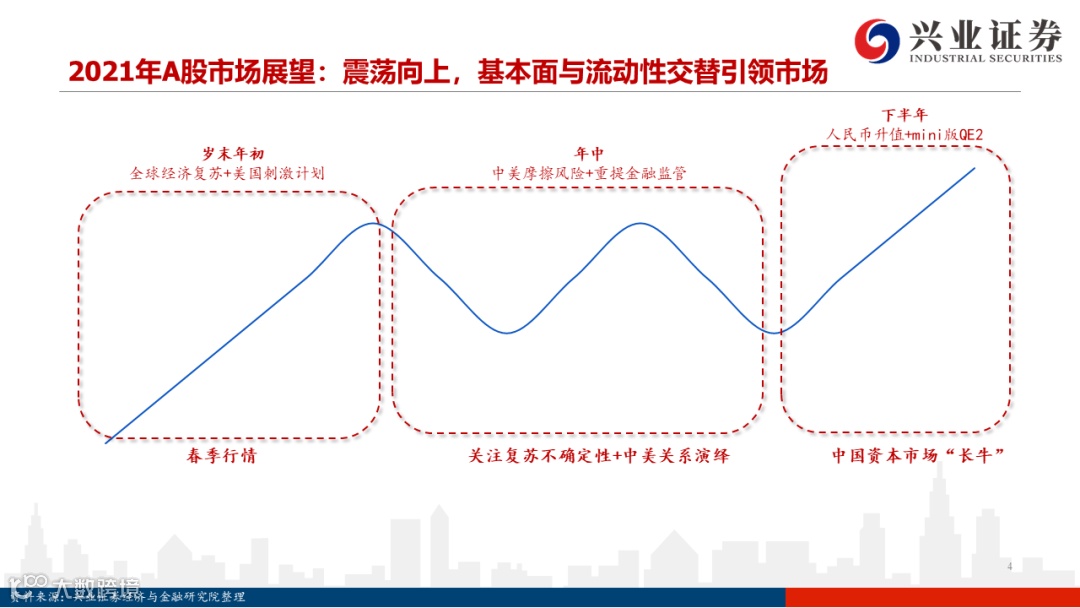 2021年作为“十四五”开局之年和A股“三十而立”后的第一年,无论在制度环境、投资者结构、还是上市公司质量上都呈现出一片新气象,2021年市场整体将波动向上。全球经济基本面从疫情中恢复向上,流动性预期变化是引导行情的主要矛盾。岁末年初是重要的投资时点:基本面持续向上,内外经济改善,景气向上补库存品种有望成为受益方向。待经济增速拐头向下,流动性将阶段性成为市场焦点,其预期改善有望为投资者提供较好买点,此时流动性受益的方向值得投资者重点关注。