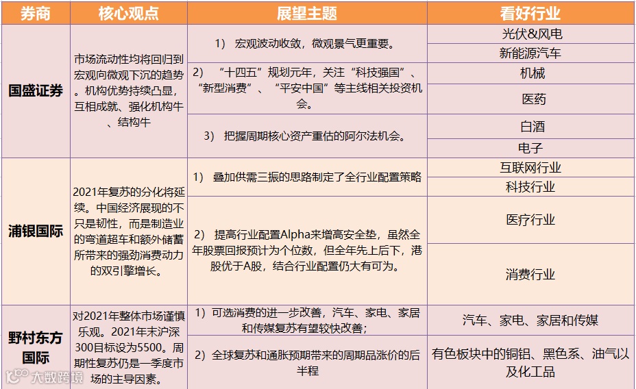 宏观方面确定性与不确定性交织,2021年复苏的分化将延续。中国经济展现的不只是韧性,而是制造业的弯道超车和额外储蓄所带来的强劲消费动力的双引擎增长。投资策略则立足于中国及全球共振复苏的主线,叠加供需三振的思路制定了全行业配置策略,提高行业配置Alpha来增高安全垫,虽然全年股票回报预计为个位数,但全年先上后下,港股优于A股,结合行业配置仍大有可为。