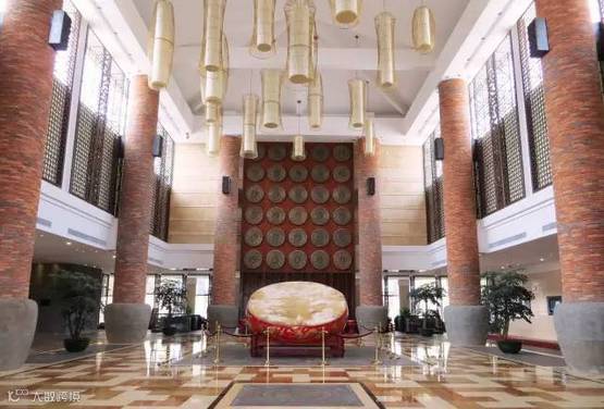 鼓锤化身为八根顶天立地的梁柱,大厅中间设有一个十平方鼓面的牛皮大鼓,吊灯是鼓形灯,背景则是一面鼓墙。