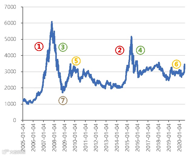 数据来源:wind,截至2020/7/31。一路上涨:①2006/6/14-2007/10/16,定投复合年平均收益率82.30%;②2014/7/21-2015/6/12;一路下跌:③2007/10/17-2008/11/4,定投复合年平均收益率-36.41%;④2015/6/15-2016/1/28;频繁波动:⑤2009/7/21-2011/4/18,定投复合年平均收益率4.11%;⑥2019/3/8-2020/6/29,定投复合年平均收益率10.04%;先跌后涨:⑦2007/10/17-2009/8/4,定投复合年平均收益率12.73%。