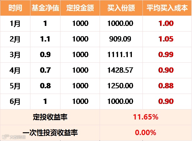 比如下表中的假设案例,每月以固定的1000元买入基金,在净值高时买到的少,净值低时买到的多,买入成本不断被平均的同时,其波动也明显小于基金净值的波动。也就是说,投资成本的不断平均使得定投的风险和波动被分散,从而小于一次性投资。