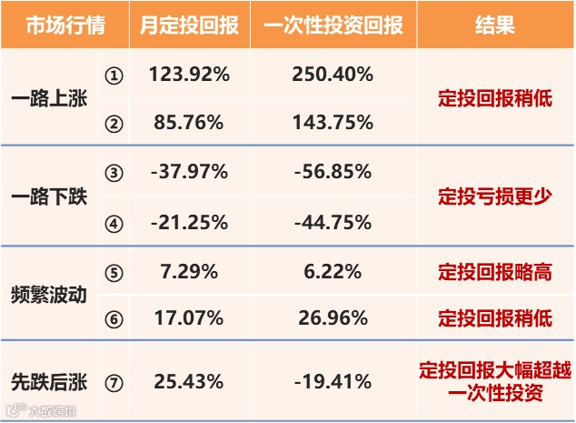 一般而言,在下跌市,定投的跌幅会更小;在上涨市,定投的涨幅则会稍逊色一次性投资;而在先跌后涨的市场,定投效果最好,收益往往能大幅超越一次性投资。