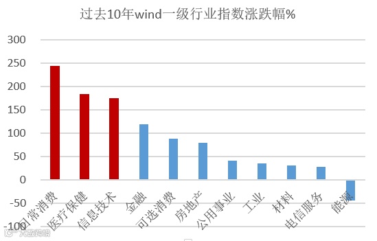 小赢:“你的家教难道教的是凡学吗?看看大盘吧,过去十年,日常消费、医疗保健、信息技术为代表的成长板块表现最为突出,这些行业领涨的背后,肯定和我国以消费为主导的经济转型有关啊!”