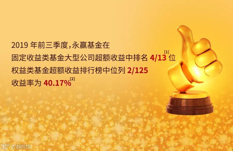 [2]数据来源于《海通证券基金公司权益及固定收益类资产超额收益排行榜-权益类基金超额收益排行榜》,统计截止时间为2019年9月30日,永赢基金旗下权益类基金超额收益最近一季 (2019.07.01-2019.09.30)收益率8.75%,排名13/132;最近半年(2019.04.01-2019.09.30)收益率5.85%,排名49/129,最近一年(2018.10.08-2019.09.30)收益率35.37%,排名2/120。权益类基金包含主动型管理的基金,不含指数型、生命周期混合型、偏债混合型基金、港股灵活策略混合型、港股偏股混合型、港股强股混合型和QDII基金。