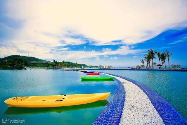 敏捷·欢乐黄金岛水晶湖总面积达8万平米,长约1公里,从天空俯瞰,仿若一条全透明的水晶链,镶嵌于大海边上。