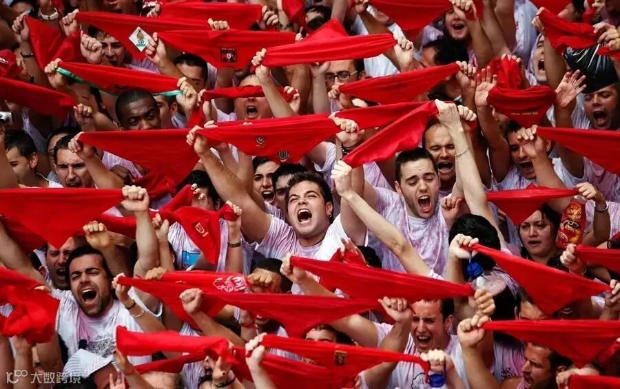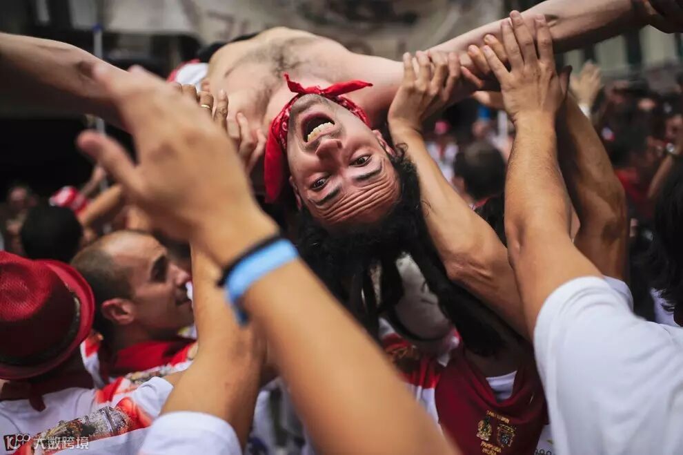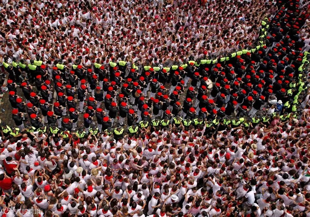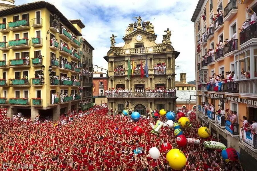 当地时间2016年7月6日,西班牙著名的奔牛节(又称圣费尔明节)登场,大批“嗨翻天”的游客挤满潘普洛纳广场,彼此朝对方身上喷洒红、白葡萄洒。民众享受着从阳台和高空泼下的水,燃放“冲天炮(Chupinazo)”, 这标志着一年一度的西班牙潘普洛纳奔牛节拉开序幕,最为重要的奔牛活动从7日开始。
