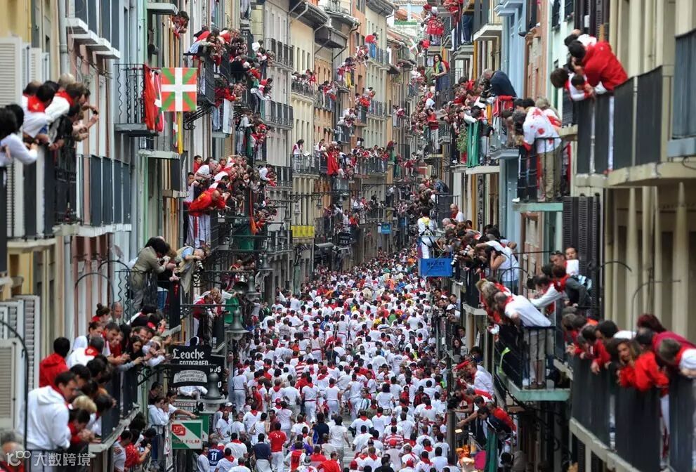 站在潘普隆纳旧城区街道两边阳台上观看奔牛?