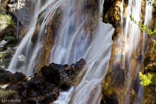 滔滔水流自诺日朗群海而来,经瀑布的顶部流下,如银河飞泻,声震山谷。南端水势浩大,寒气逼人,腾起蒙蒙水雾。