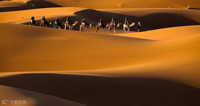 撒哈拉沙漠大门--梅祖卡,进入沙漠腹地,安排骑骆驼在沙漠中穿行,这里的撒哈拉是独一无二的,以形态各异的沙丘闻名,更因为它会随着自然光线的变化,展现出金色、粉色等不同的美丽色泽。日出日落会有不同的美景,成为了摩洛哥境内独特的大漠风光,更成为无数人梦中的撒哈拉!