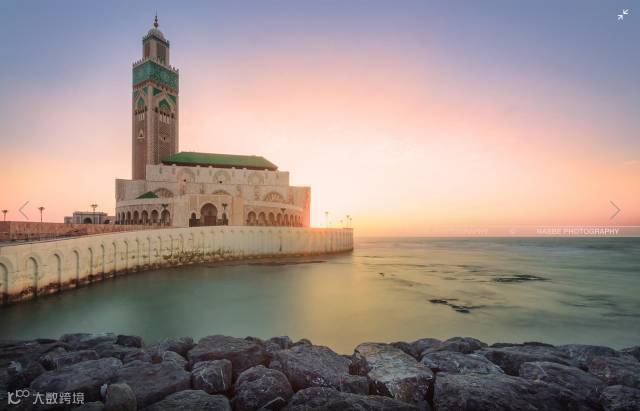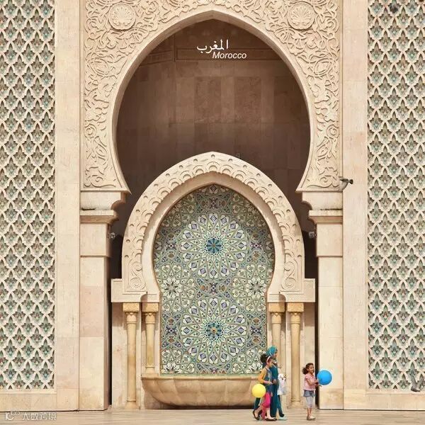 三分之一面积建在大西洋上的是世界第三大清真寺——哈桑二世清真寺,五颜六色的的琉璃瓦极尽华美,200米高的宣礼塔更是兼具宏伟和精美,唯美的伊斯兰纹饰、面朝大海的窗户、带来无比神圣与浪漫…