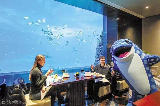 这个园区最具特色和风格的餐厅位于鲸鲨馆左侧,海底画面一览无遗,连眼前的饕餮盛宴也更显美味了。