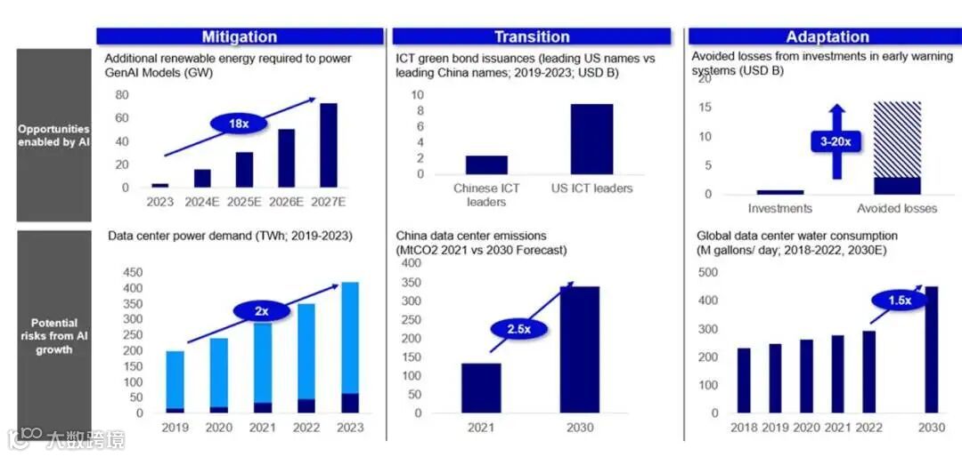 来源:摩根士丹利《电力人工智能分析》;国际能源署《智能电网》(https://www.iea.org/energy-system/electricity/smart-grids );联合国减少灾害风险办公室,《为所有人提供早期预警》,2022年3月,https://www.undrr.org/implementing-sendai-framework/sendai-framework-action/early-warnings-for-all;油价网,《摩根大通全球人工智能数据中心将消耗大量淡水》,https://oilprice.com/Energy/Energy-General/JPMorgan-Global-AI-Data-Centers-Will-Consume-Huge-Amounts-of-Fresh-Water.html ;中国水风险《中国信息通信技术转型》(https://chinawaterrisk.org/wp-content/uploads/2023/09/CWR-2023-China-ICT-Transition-The-good-bad-ugly-of-5-HKEX-ICT-listcos-net-zero-pledges-climate-action.pdf )