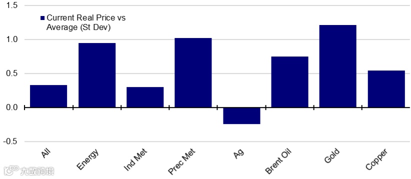 图⑩表明,与历史标准相比,能源和贵金属子类别是最高的。而图11则显示了石油很少达到最近的峰值(以今天的价格衡量)。