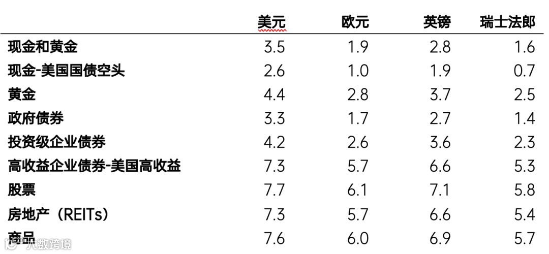 图⑤显示了他们在一系列货币基础上对全球资产类别的预期回报(他们的框架与我们的不同,所以我们不得不调整他们的一些类别——例如,我们使用他们的美国国债短期类别来代表现金,而贵金属则用于黄金)。