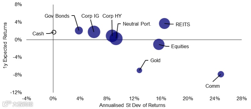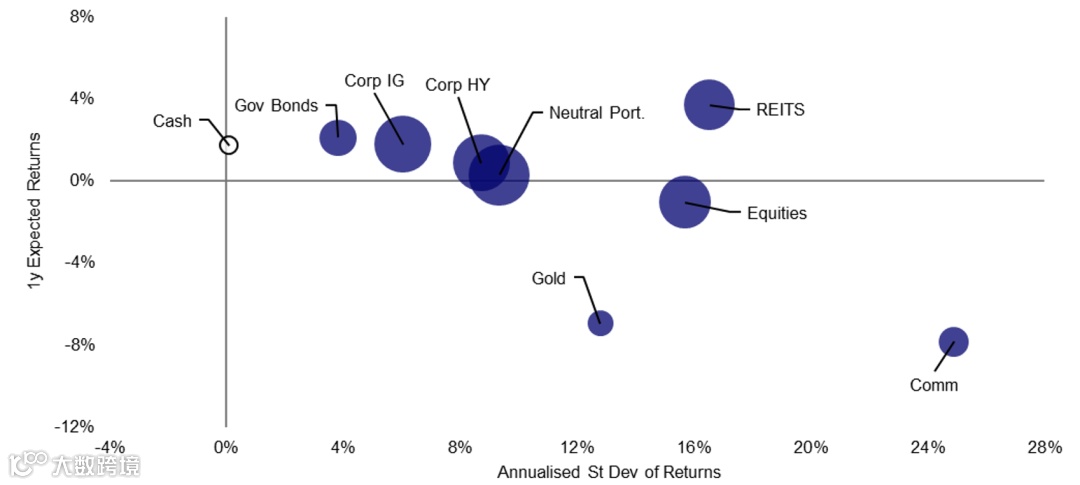 图①:1年期预测回报率:全球资产与中性投资组合