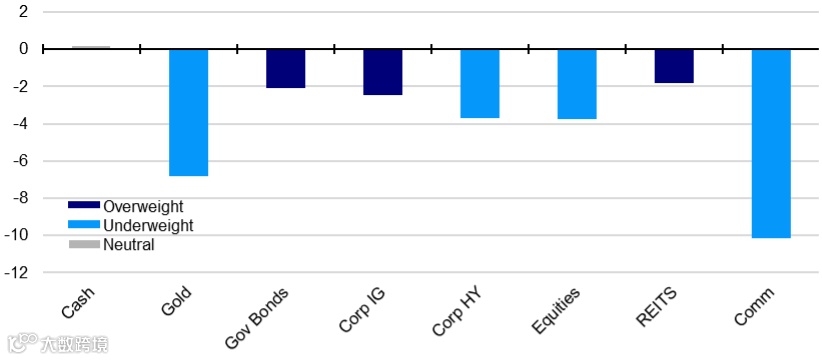 政策利率继续上升,我们预计美国和欧洲的主要央行利率,未来几个月将继续大幅上涨,达到2008年以来的最高水平。因此,现金在最近几年一直是一个很好的多样化因素(与其他资产没有波动性或相关性),现在也提供了比一段时间以来更多的补偿。考虑到通胀、央行政策和增长前景的种种不确定性,我们预计现金的表现将胜过许多其他资产。尤其是在风险调整的基础上。因此,我们将现金增持比例从5%上调至8%(中性为2.5%)。