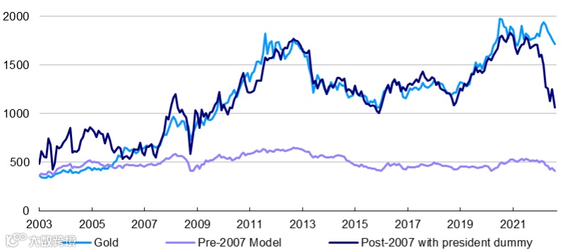 然而,我们注意到,如果黄金转变为全球金融危机前的行为(随着通胀上升)模型建议的价格甚至会更低(见图12中的“2007年前模型”)。