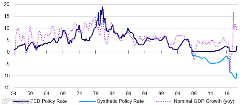 不过,我们预计,短期政策缺口的填补,很大程度上将来自名义GDP增速的下降。而美联储资产负债表的收缩将逐步提高综合利率。