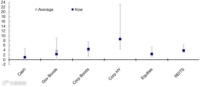 图⑨从历史角度分析了这些全球收益率。可以看出,一些资产的收益率接近历史正常水平,但没有一种资产的收益率高到足以仅从估值角度鼓励乐观情绪。唯一的例外是新兴市场,特别是房地产(REITs),其收益率为5.7%。