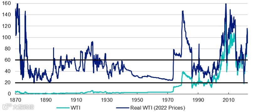 图11:1870年以来美国石油实际价格(美元/桶,CPI调整)