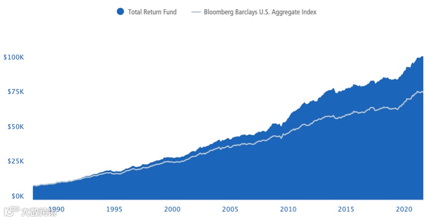 美国明星基金公司PIMCO的总回报基金(Pimco Total Return Fund)就是其中翘楚。该基金的净值走势长期稳健向上,自20世纪80年代成立以来,长期收益一直强于彭博巴克莱美国总债券指数,为数不清的家庭和机构换来“稳稳的幸福”。