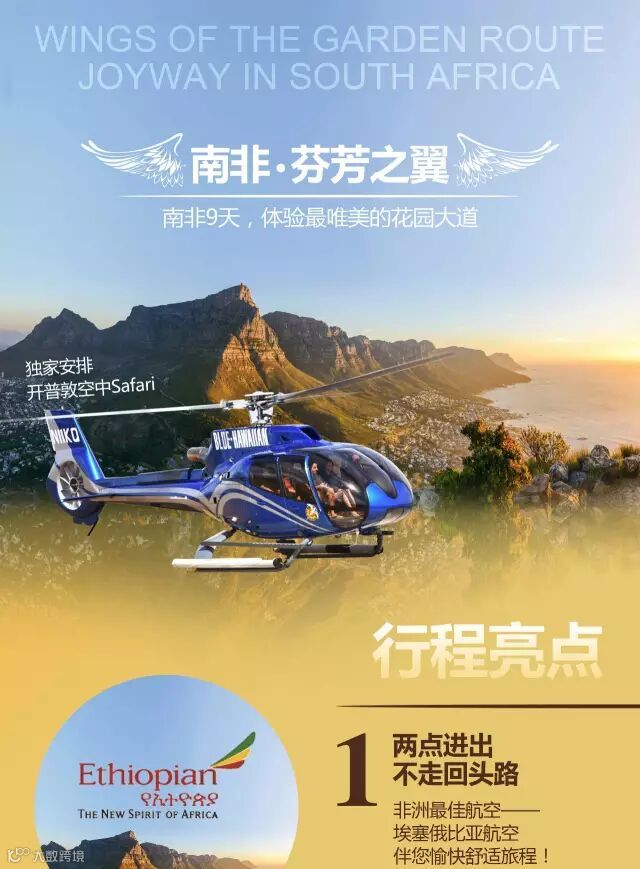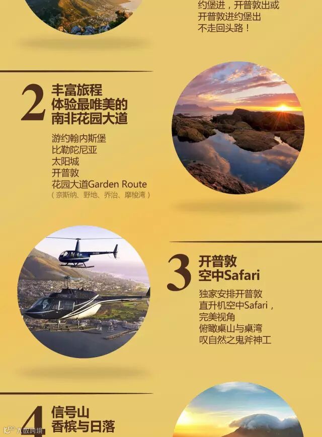 酒店早餐后驱车前往野地”(Wilderness)的小镇;后乘车往印度洋滨海风景优美的摩梭湾,邮政树,迪亚斯综合博物馆;抵达开普顿后用午餐。后前往信号山,观开普敦市容;当我们站在信号山的山顶,鸟瞰开普敦城市美景,怎能没有香槟的陪伴。一边喝着南非香槟,一边欣赏着辽阔的海景,人生最大的美式,不过如此!傍晚乘坐直升机高空鸟瞰魅力开普敦的无上美景,和大西洋海岸线。(此为赠送项目:如遇到天气原因或者机械故障等客观因素导致不能飞行,则此项目取消,费用不予退)。晚上特别推荐自费海鲜大餐。后送入酒店休息。宿:开普顿