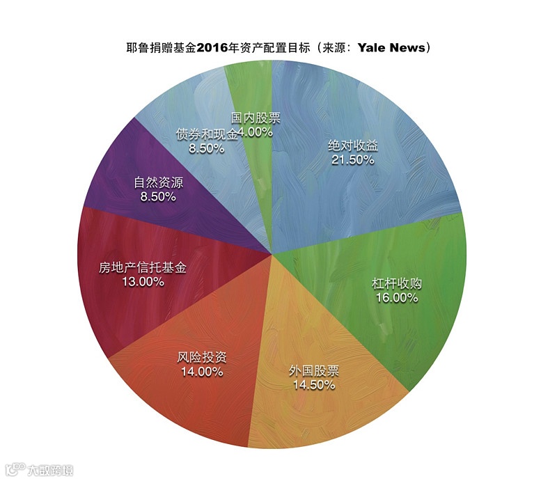 所以耶鲁的组合看起来很炫酷,比如耶鲁捐赠基金2016年的资产配置目标是这样的。史文森《非凡的成功》这本书里面有对于下面每一种资产的详细梳理,有兴趣的建议找来读一读。