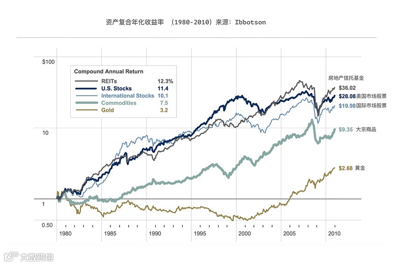 有人可能会说以上研究只有股票和债券,资产类别太单寡。我们可以再看看诸如房地产信托基金(REITs)、大宗商品和黄金。能够全部涵括这些资产的研究不多,没办法追溯到二十世纪初期那个古老的年代,但我们能凑活看伊博森咨询公司提供的一个三十年数据。我们可以看到在1980-2010间表现最出色的是仍然是REITs和股票,黄金、大宗商品仍然表现很弱。大家REITs 这么牛,别误会炒房能防老,这里的房地产信托基金是指可以产生稳定现金流的商业或住宅地产投资,与股票很相似,交易规则与流动性也与公司普通股一模一样。