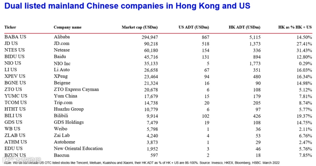 图3:同时在香港和美国上市的中概股一览(景顺投资制图)