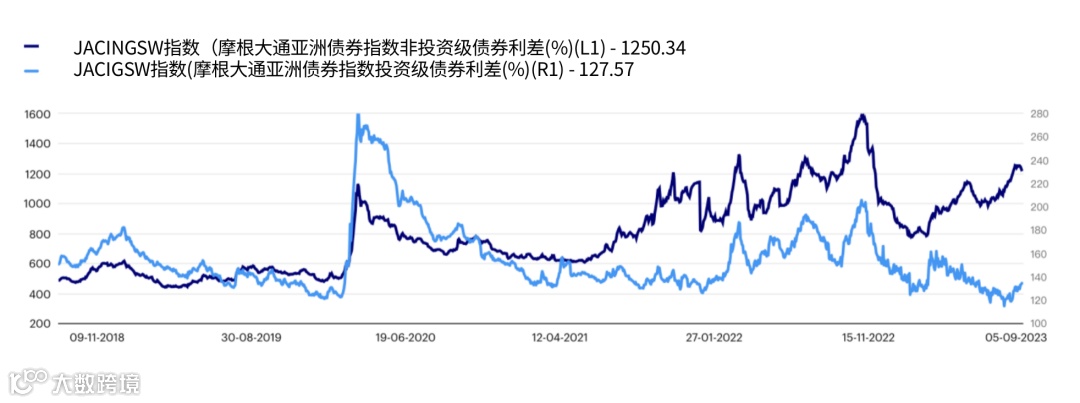 图 :JACI 投资级债券与 JACI 高收益级债券(2018 年 8 月 – 2023 年 8 月)