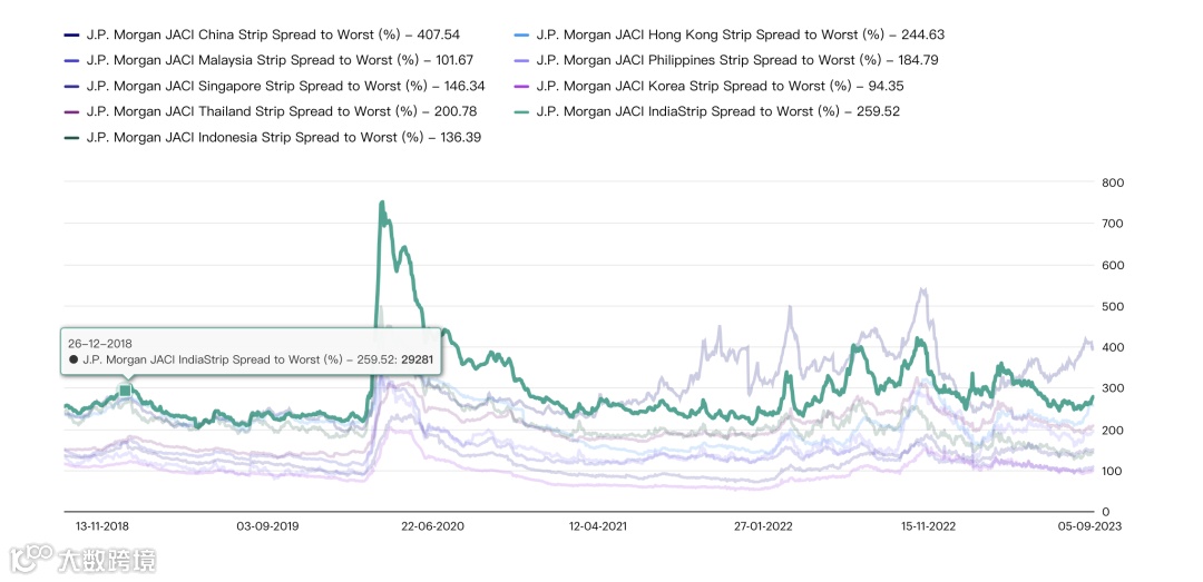图 :过去 5 年按国家划分的亚洲信用利差