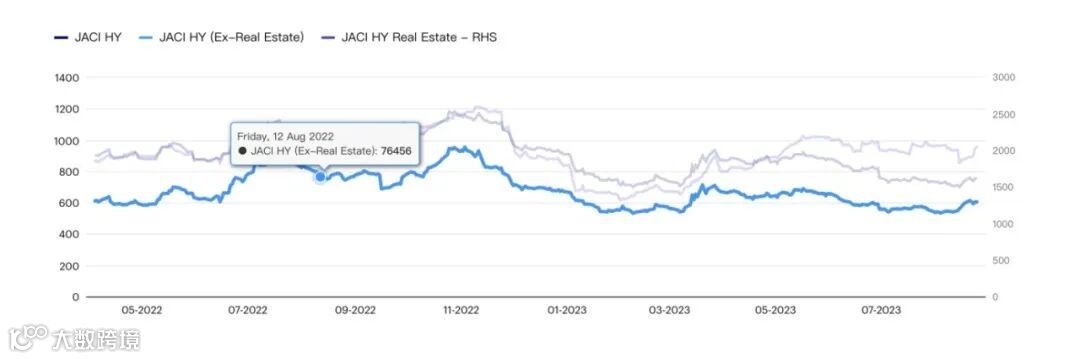 摩根大通高收益指数利差在第三季度相对有韧性,利差接近 2 月份银行危机前的水平。主要受益于稳定的信贷基本面(地产板块以外)。2023 年,除中国外的摩根大通高收益指数尚未出现违约。