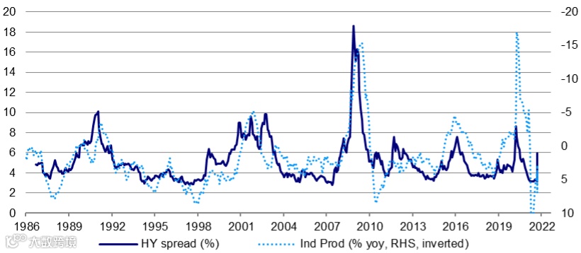 图10表明工业生产增长与高收益利差之间存在逆周期关系。我们已经注意到,高收益信贷的收益率比其他资产类别的收益率上升幅度更大,下图表明美国高收益利差可能已经预测到比目前看到的更大的经济放缓。然而,我们预计大多数经济体将进一步减速,并且看到这些利差进一步扩大也不会感到惊讶(这同样适用于投资级信贷)。与此同时,我们预计经济放缓将压低长期政府收益率,因此信贷工具收益率的上升幅度可能低于仅考虑利差所暗示的水平。
