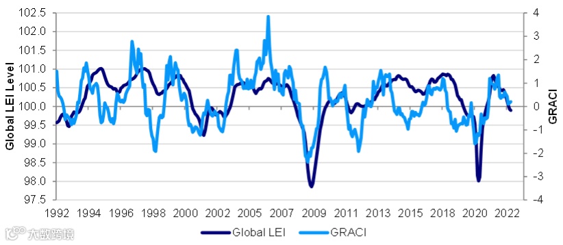 全球领先经济指标(LEI,Leading Economic Indicator)表明全球增长低于历史标准,而全球风险偏好周期指标(GRACI)表明风险偏好正在恶化。因此得出结论,我们正处于收缩状态。