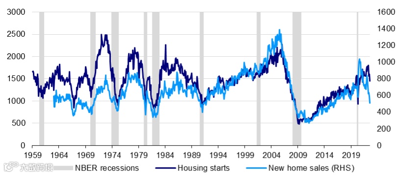令人惊讶的是,在NBER确定自1959年以来的每次衰退之前,房地产市场都在萎缩(诚然,在某些情况下滞后多年)。更重要的是,在房地产大规模衰退期间(1960年代中期)只有一次没有出现衰退。我们认为,这段历史至少应该作为一个警告,即美国经济衰退就算不是必然的,是有可能性的。