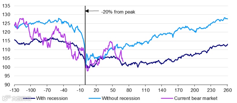 历史表明,是否存在衰退对股市的未来走向至关重要。图9总结了自1957年以来标准普尔500指数熊市的历史,并根据它们是否与衰退有关对其进行分类。看来,一旦达到熊市区域,股市就会反弹。当没有衰退时,市场会继续走高,但当出现衰退时,它往往会再次波动,也许会达到新低。美国股市目前的走势在这两类之间波动。