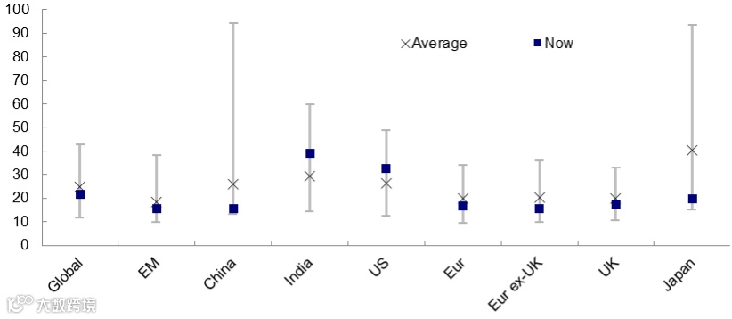 跨地区比较的话,图13表明在美国以外(印度除外)可以找到最便宜的股票估值。在新兴市场中,中国股市看起来很有吸引力(在我们看来),我们认为由于政策支持,这提供了提升的可能性。欧洲和日本的估值也相对有吸引力,这两个国家现在都在从强势美元中获得竞争优势(我们认为日本的经济风险较低,因为通胀较低且对俄罗斯的能源依赖较少)。