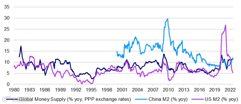 根据图3中的证据,全球货币增长虽然低于2020年,但今年仍有所改善。在美联储和其他西方央行实施紧缩政策的背景下,这可能看起来很奇怪(下图可以看出美国的货币供应增长是如何急速下降的),虽然图3显示中国的M2增长已经回升,但由于中国货币增长并不会大规模流入世界其他地区,因此很难解释全球货币供应增长的上升。然而,中国并不孤单,例如加拿大、墨西哥和南非,今年的货币总量也在加速增长。