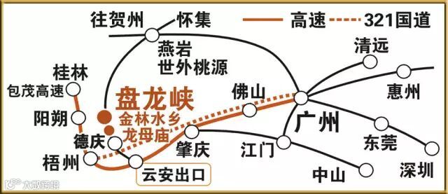 广州驱车2小时到达德庆(西出广州上广三高速,沿广梧高速,往梧州方向,云安出口下,约需2小时);由德庆驱车前往桂林阳朔,仅需2.5小时。