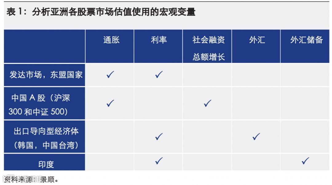下表总结了我们在分析亚洲各个股票市场的估值水平时所考虑的宏观变量:
