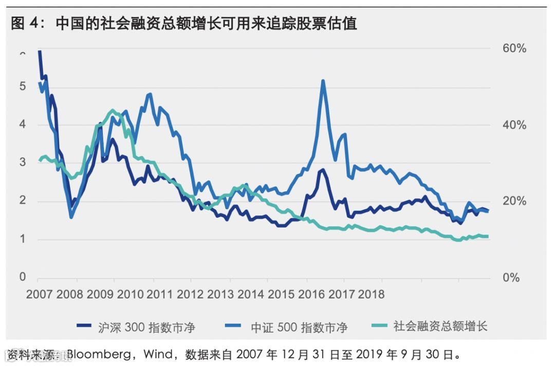 对于中国 A 股,我们发现中小盘股中证 500 指数的估值变化(按市净率)可以使用两个宏观因素给出合理解释:通货膨胀和社会融资总额 (TSF)。社会融资总额是指在一定时间内,中国国内金融体系向实体经济私营部门提供的资金总额。我们还发现,虽然货币供应量 (M2) 增长可以在很大程度上解释中证 500 指数的估值变化,但这一指标与社会融资总额增长高度相关(图 4)。因此,我们的模型排除了 M2 增长,以避免多重共线性问题。这些发现与我们对沪深 300 指数(代表大盘股)的发现一致。