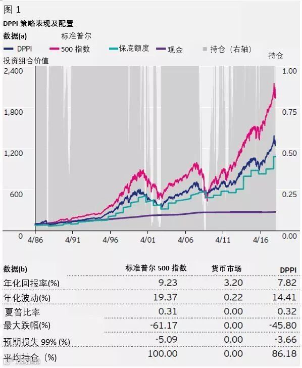 数据(a)内图表所示为随着时间的移动,运用DPPI策略的股票投资组合(标准普尔500指数)(蓝线)有关保底额度(绿线)的表现。持仓根据保护垫(投资组合价值与保底额度之间的差额;此处为投资组合年度初始价值的85%)及乘数(根据每日风险预测;此处为GARCH 99%-ES)计算。为作比较,我们已计入相关标准普尔500指数(粉线)及货币市场投资(紫线)的表现。数据(b)所示为相应的表现指标。期间:1986年4月9日至2018年4月9日;1986年4月9日= 100。资料来源:彭博资讯,景顺。此数据为模拟过往表现,过往表现并非未来回报的指引。