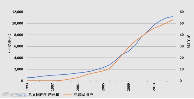 中国近年的发展证明了急速经济增长与科技发展往往相辅相成。2005年,中国作为全球第六大经济体,可接入互联网人口占全国人口总数不足十分之一。十年后,互联网用户增长至全国总人口一半,并创造了一个刺激消费开支及提升运营效率的平台。在这期间,中国经济增长了近五倍,成为全球仅次于美国的第二大经济体(图4)。预计互联网将继续推动中国经济发展,为中国至2025年的经济增长率贡献0.3至1个百分点[7]