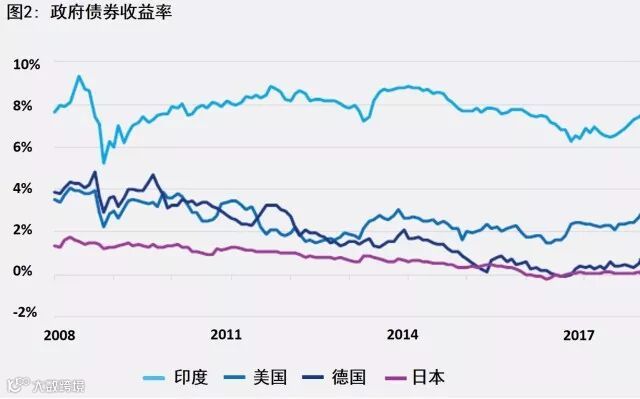 资料来源:彭博、景顺。数据从2008年2月29日到2018年2月9日。印度:10年期政府债券基准买入收益率;美国:基准10年期政府债券收益率;德国:10年期德国政府债券拍卖平均收益率;日本:基准10年期政府债券收益率。