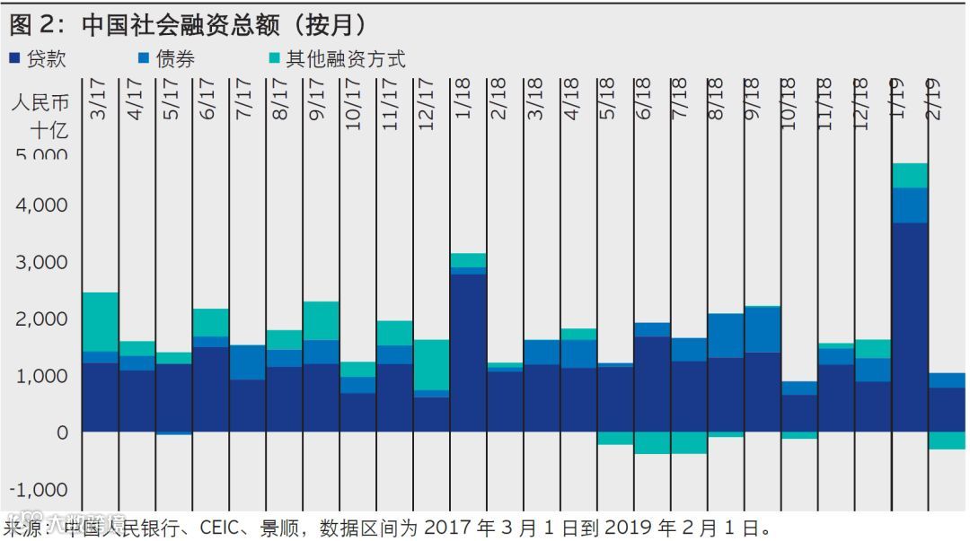 放宽信贷要求和完善货币政策传导机制:2019 年的关键政策着力点可能是完善货币政策传导。为确保“流动资金增加”转化为经济领域的“信贷增长”,央行自去年起便已宣布一系列信贷增强措施,包括用于银行贷款展期和信用债券投资的贷款安排、放松新资产管理规定以及推动银行资本重组的债券互换。宣布这些措施后,国内信用债券发行显著增多,市场信心有所提高,促成更广泛授信,实现经济复苏(图 2)。