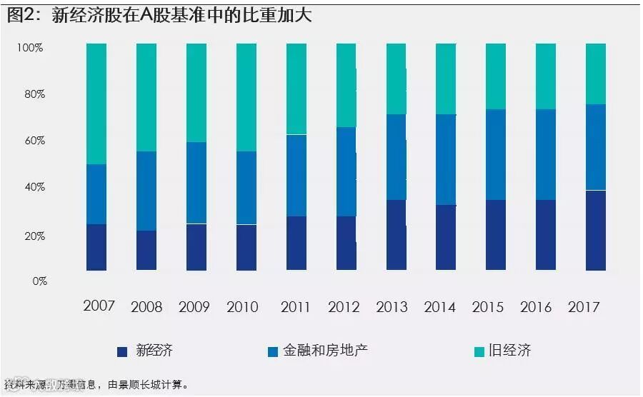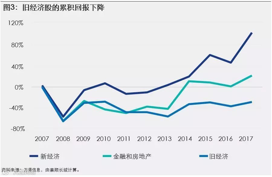 截至2017年底,旧经济股仅占指数的25.7%,而新经济股的权重升至35.3%。在这十年间,旧经济股的累计回报下降29%,而新经济股的回报率增长103%。新经济股比重上升更准确地反映出中国的经济转型,截至2017年底,私人消费占国内生产总值的39.1%。