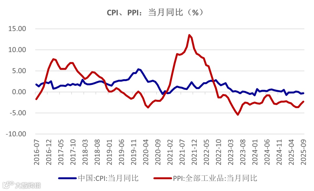 统计局公布了国内9月份通胀数据。从数据结果看,9月份CPI和PPI延续同比回落,但回落幅度均有缩小。CPI当月同比为-0.3%,较上月回升0.1个百分点,当月环比为0.1%,其中食品CPI同比回落4.4%,对CPI拖累较重,而非食品CPI为0.7%,延续了此前的同比增长态势,且有望继续抬升。从数据端分析,国内消费,尤其是食品消费需求仍然较弱,未来有进一步提振空间。9月份PPI同比为-2.3%,较上个月回升了0.6个百分点,其中生产资料当月同比为-2.4%,较上个月回升了0.8个百分点,反观生活资料PPI,则延续了1.7%的同比回落,与上个月持平。总结国内的通胀数据可知,国内生产活动开始有所恢复,但居民的生活资料需求仍然未得到提振,价格承压的态势未有变化。